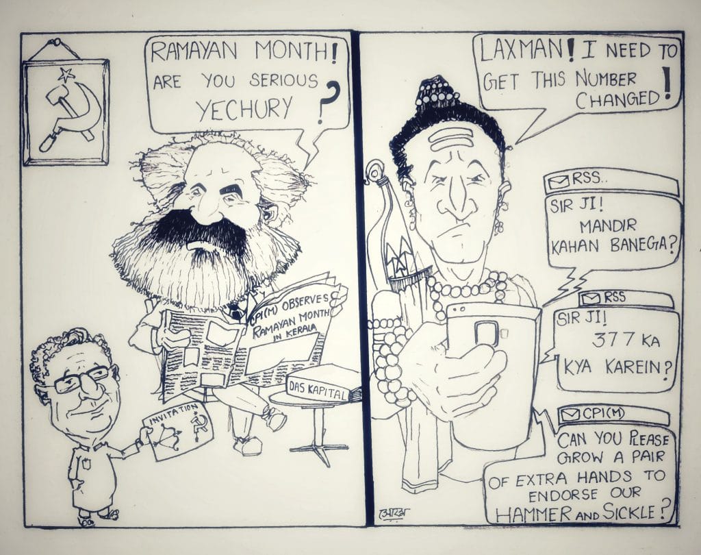 Cartoonist Manjul picks on the Communist Party (Marxist) and its decision to observe ‘Ramayana Masam’ (Month of Ramayana) in Kerala.