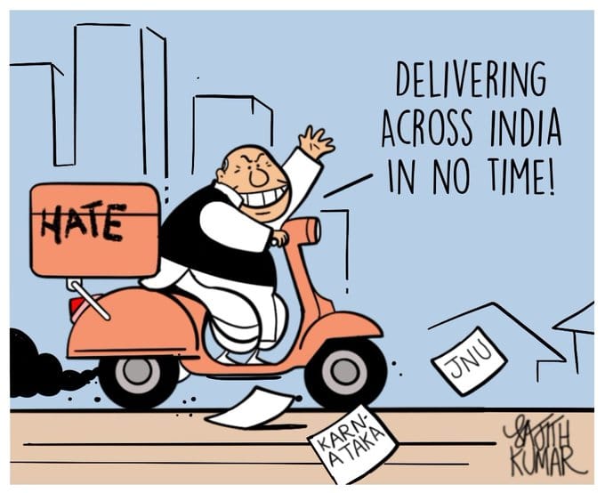 Sajith Kumar alludes to Zomato’s idea for 10-minute food delivery, and uses it to mock the rising hatred across the country, such as in Karnataka and Delhi’s JNU campus.