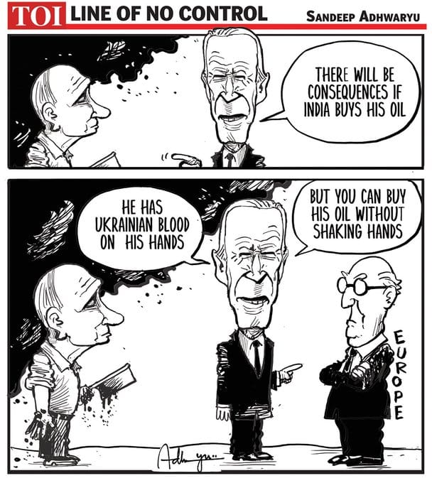 Sandeep Adhwaryu’s cartoon is a response to one that appeared in The Economist, which mocked China and India for continuing to buy oil from Russia amid the war in Ukraine. Adhwaryu claps back using US President Joe Biden’s statement that ‘buying more Russian oil is not in India’s interest’, while Europe continues to do so. Union External Affairs Minister S. Jaishankar has mentioned Europe buying more oil from Russia compared to India.