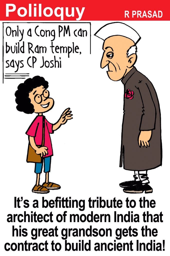 In The Economic Times, R. Prasad takes a dig at Congress leader C.P. Joshi’s controversial recent comment. The cartoonist suggests that Congress president Rahul Gandhi, the great-grandson of Jawaharlal Nehru, is on a mission to take the country backwards.