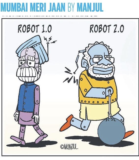In Midday, Manjul references the recently-released Rajnikanth-starrer 2.0, to depict two Prime Ministers — Narendra Modi and his predecessor Manmohan Singh.
