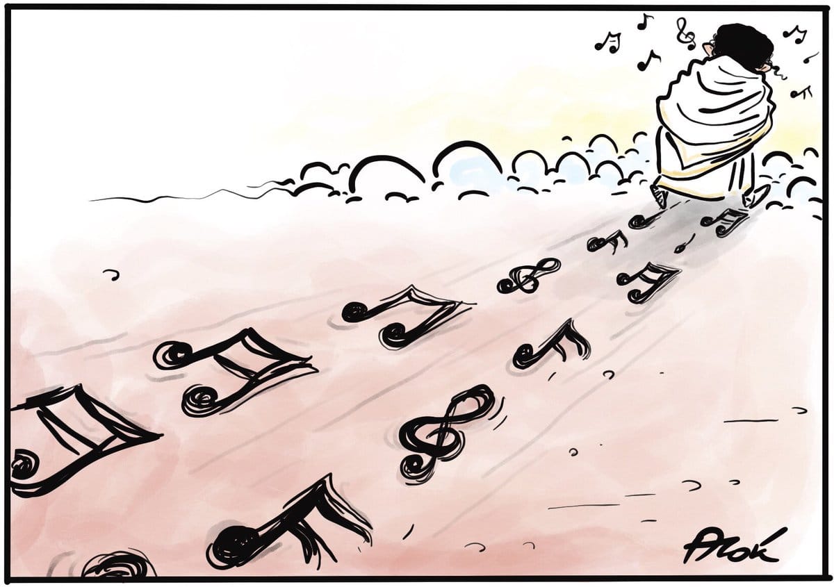 Alok Nirantar’s illustration, featuring notations as footsteps, shows Lata Mangeshkar leaving for her heavenly abode, leaving behind a rich musical legacy for posterity.