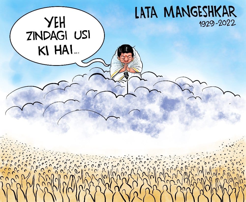 In today’s featured cartoon, E.P. Unny joins the country in paying a silent tribute to Lata Mangeshkar, the legendary singer who passed away Sunday at the age of 92 in Mumbai. As the nation enters a two-day mourning period, Unny shows the national flag — flown at half-mast — adorned with musical notations.