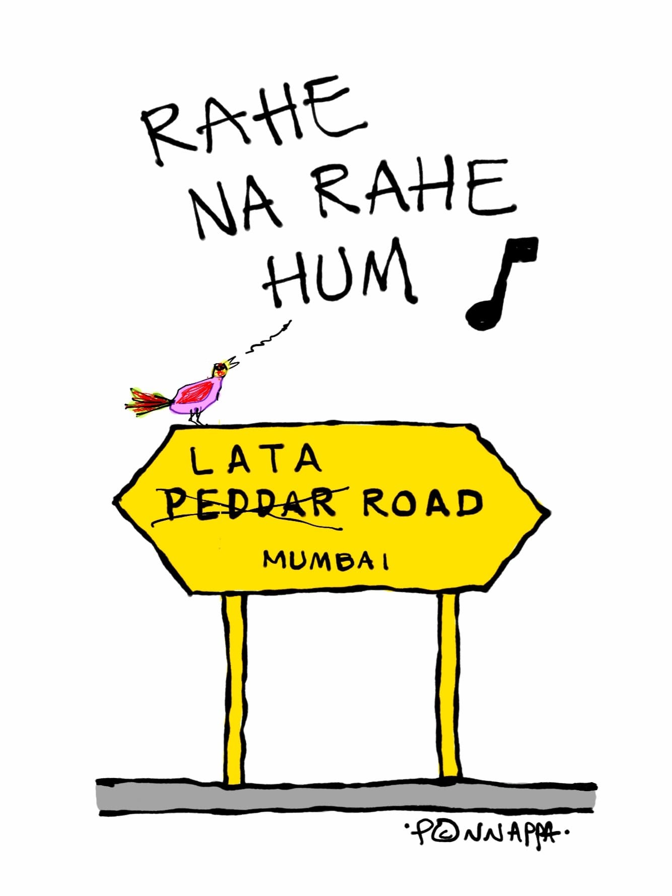 Nala Ponnappa remembers Lata Mangeshkar’s soulful song ‘Rahe Na Rahe Hum‘. A nightingale sings it on a sign of Peddar Road, Mumbai, where the ‘Nightingale of India’ resided — here, as a tribute, it’s renamed Lata Road.