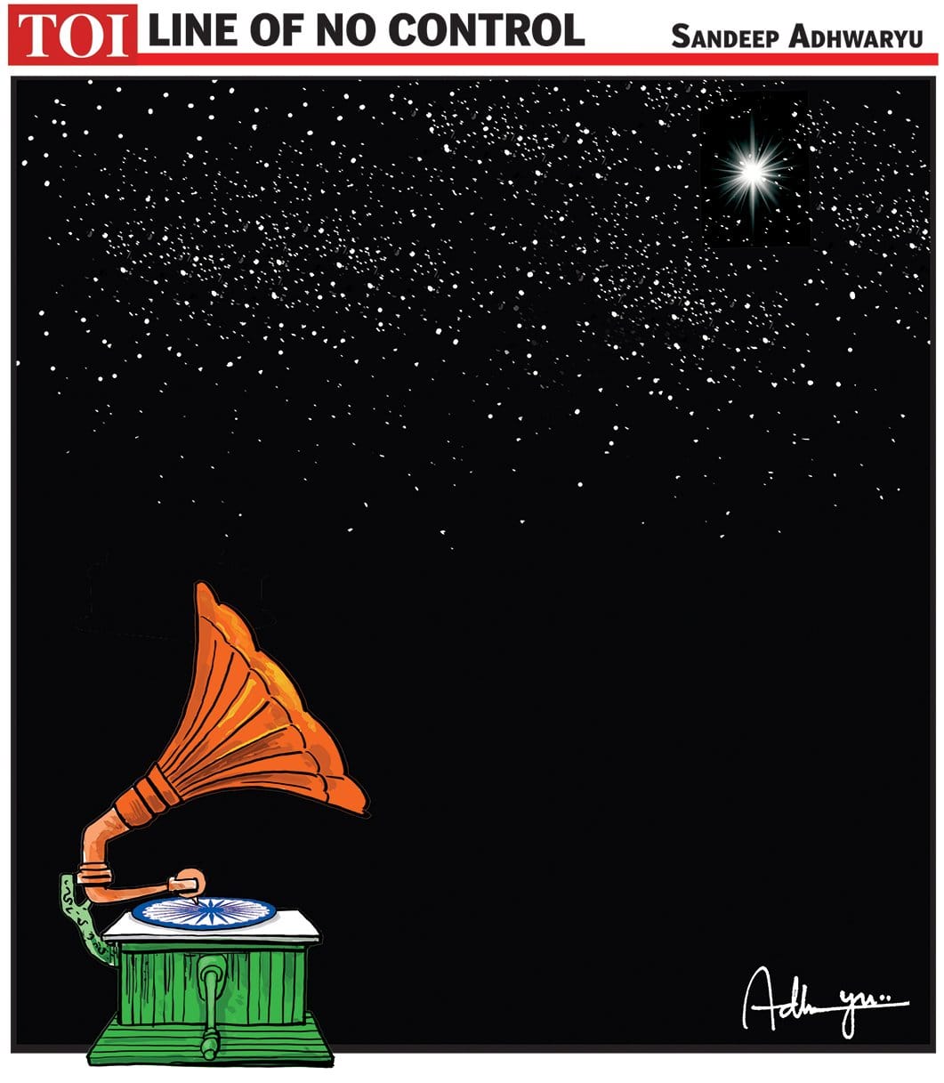 Sandeep Adhwaryu also pays tribute to the musical legend, depicting a gramophone player, swathed in the colours of the Indian flag, pointing its speaker towards a starry sky — there is a bright new star in the heavens tonight.