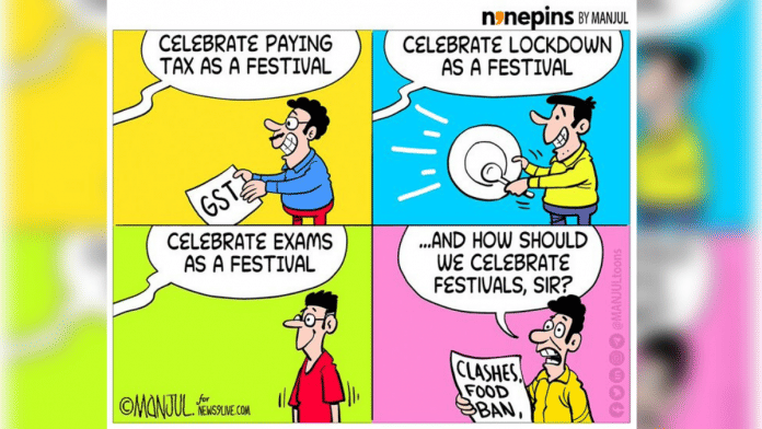 In today’s featured cartoon, Manjul mocks the propensity of the Narendra Modi government to label everything a festival, from paying taxes to living under Covid lockdown, and points to the rising wave of communal issues, including the latest call to keep meat shops shut during Navratri, to ask how one is supposed to celebrate actual festivals.