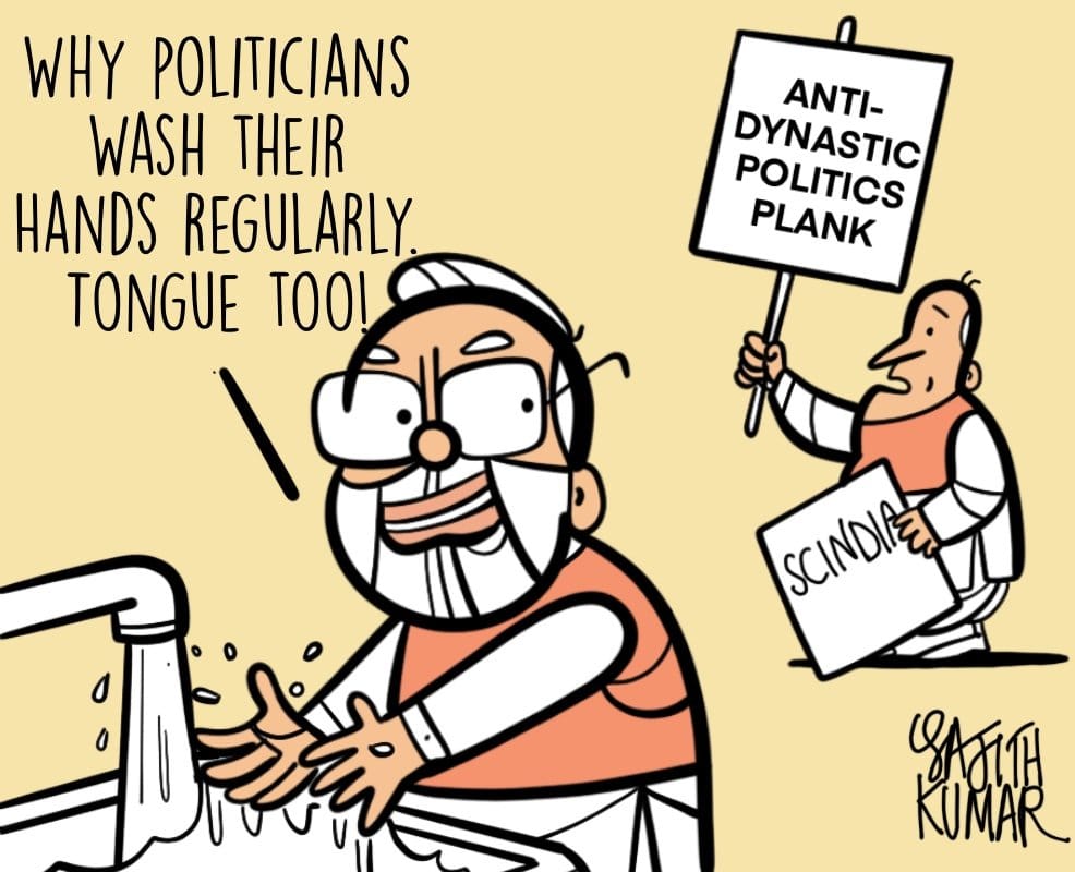 Hinting at Jyotiraditya Scindia’s resignation from the Congress recently, Sajith Kumar takes a jibe at politicians for easily washing their hands of ideologies and allegiances.