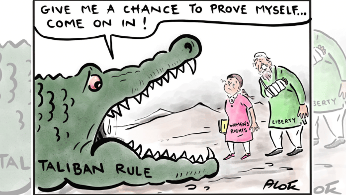 In today’s featured cartoon, Alok Nirantar’s ironical take on the Taliban’s takeover of Afghanistan. At the press conference held Tuesday, the Taliban pledged to honour women’s rights, albeit within the norms of the Islamic law.