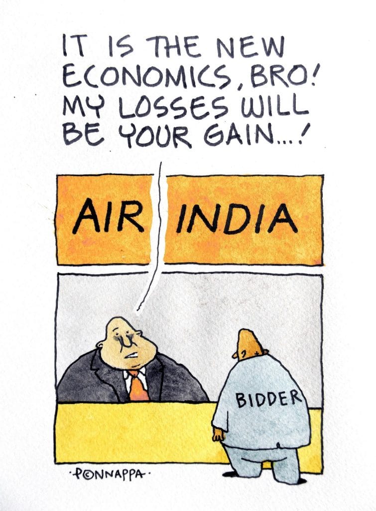 The Air India sale remained the favourite topic of cartoonists. Nala Ponnappa expressed his amusement on the fact that the future Air India buyer will have to take on a debt of more than Rs 23,286 crore.