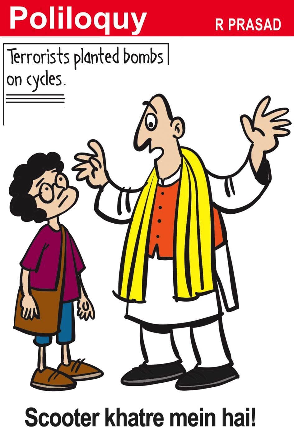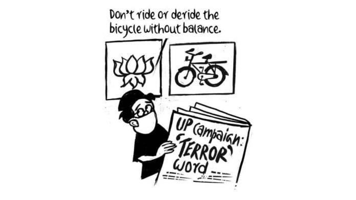 In today’s featured cartoon, E.P. Unny alludes to Prime Minister Narendra Modi’s comments amid elections in Uttar Pradesh, accusing the Samajwadi Party (SP) of shielding terrorists, saying that “bombs were kept on cycles”. The bicycle is the SP’s election symbol. This came shortly after a special court in Gujarat sentenced 38 convicts in the 2008 Ahmedabad bomb blasts to death and the remaining 11 to life imprisonment.