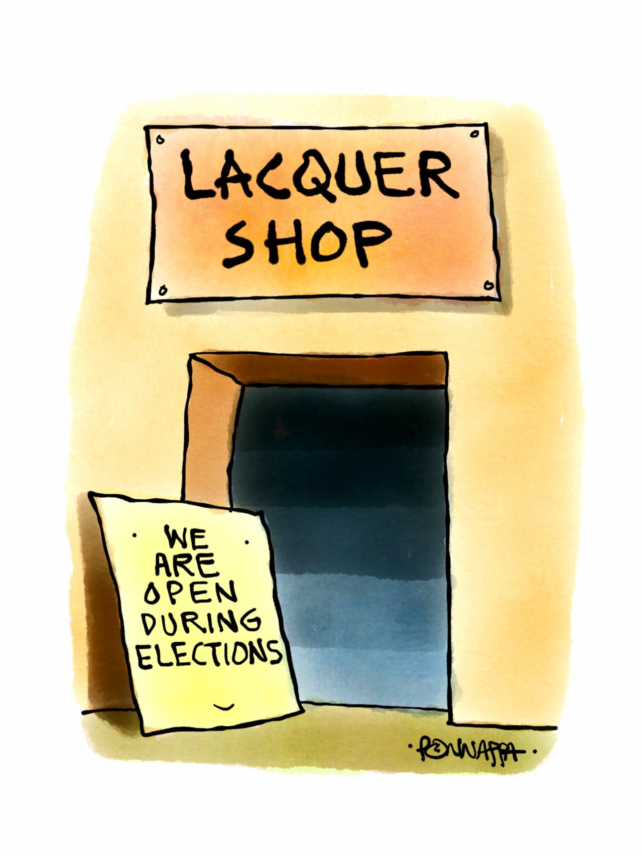 Nala Ponnappa gives his satirical take on the “lacquer shop” being open during the election, possibly referring to Delhi’s liquor scam.