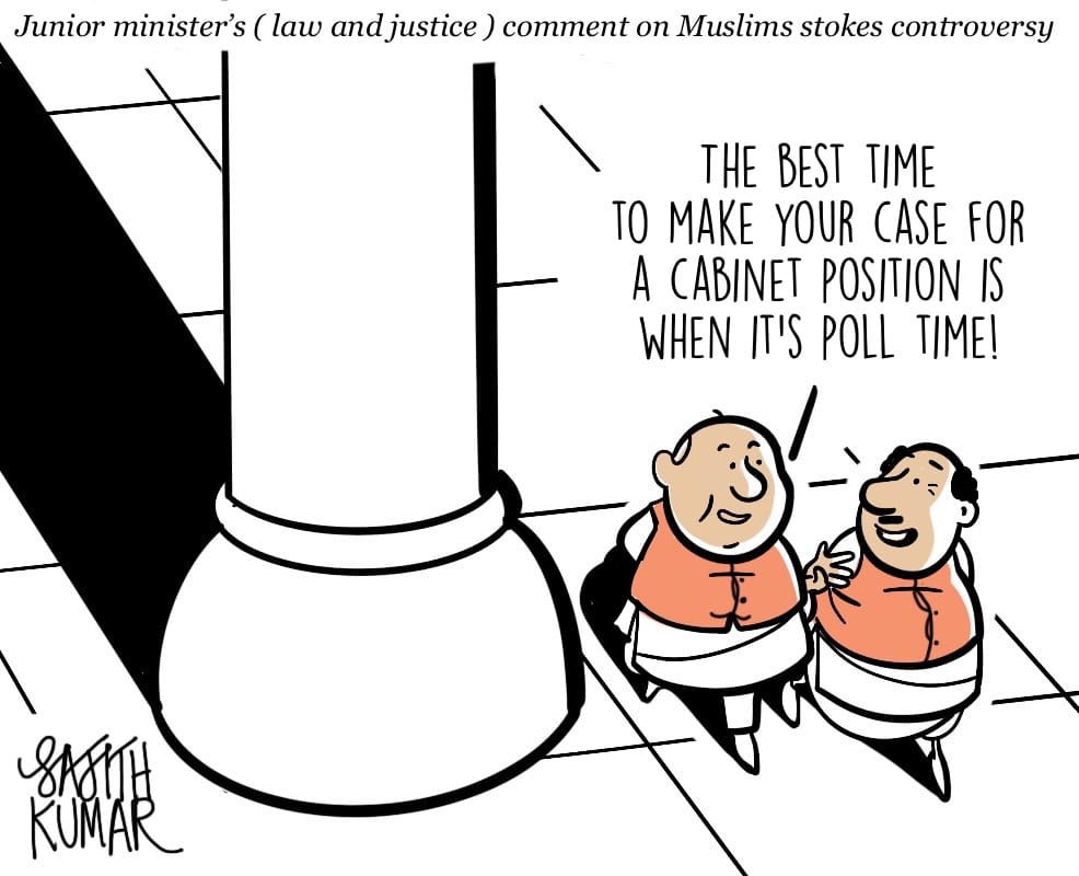 Sajith Kumar bases this cartoon on the recent comment made by Union Minister of State for Law and Justice Satya Pal Singh Baghel, who said there were very few tolerant Muslims, and even those who appear tolerant use it as ‘a mask’ to stay in public life and become Governors and Vice Presidents.