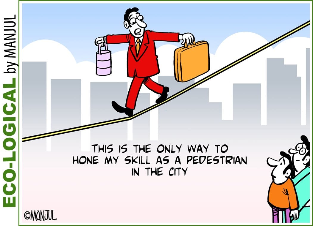 Manjul gives his take on city traffic and the problems of pedestrians, who have narrow strips of pavements to walk on.