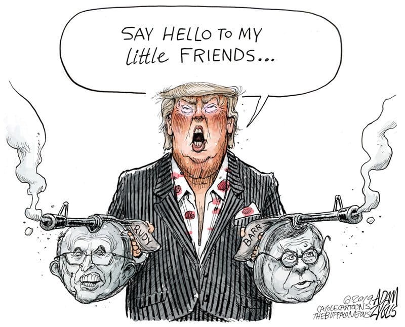 Adam Zyglis portrays Trump as Tony Montana from the 1983 mob classic Scarface, with his lawyer Rudy Giuliani and Attorney General William Barr as his “little friends”, aka guns.