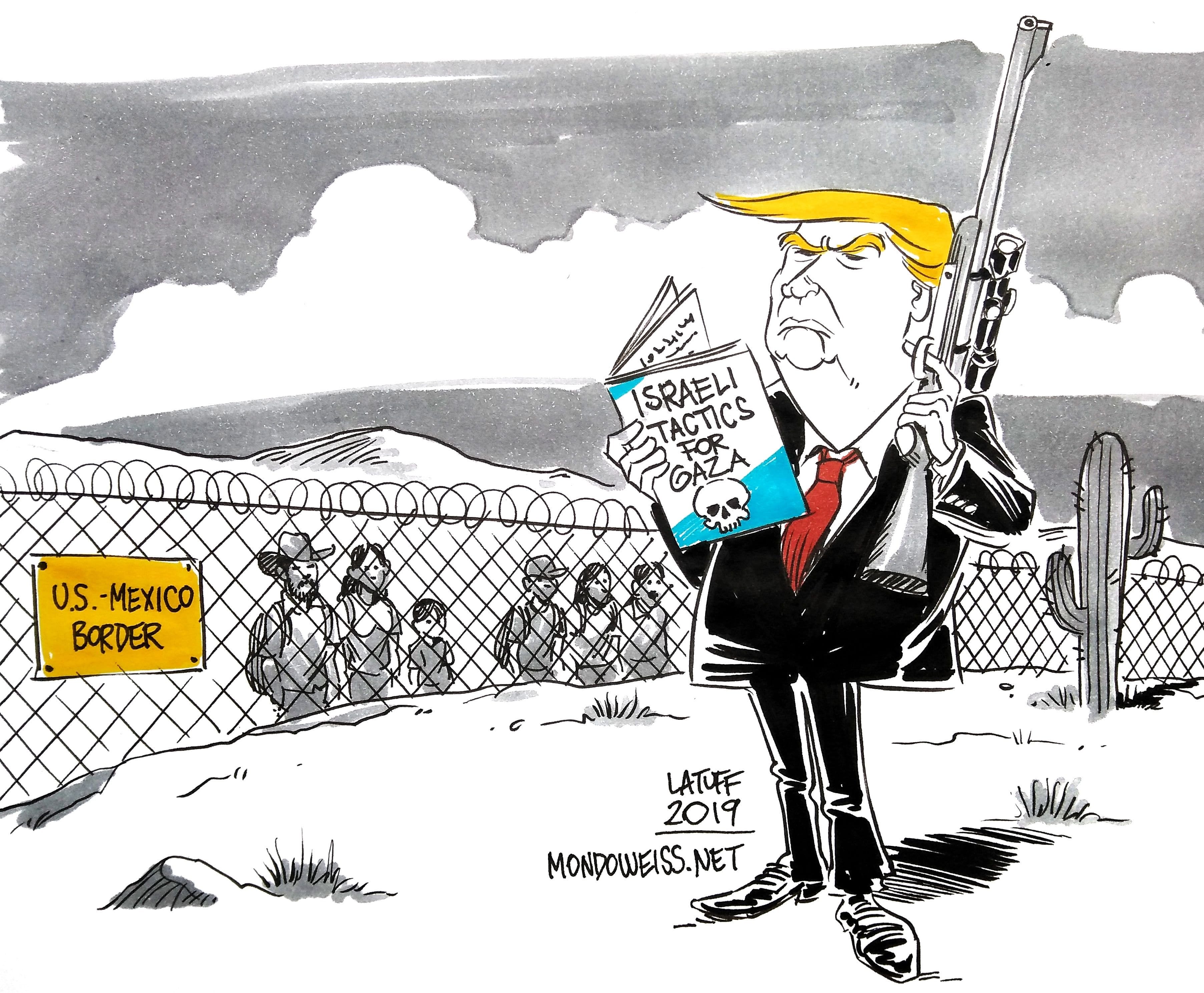 Carlos Latuff calls US President Donald Trump’s suggestion to shoot migrants in the legs to slow them down while they attempt to cross the southern border with Mexico something straight out of ‘Israel’s handbook for Gaza’.