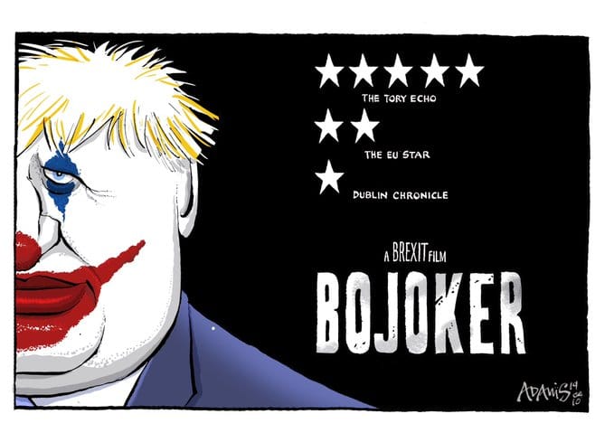 In today’s featured cartoon, Adams mocks British Prime Minister Boris Johnson as the ‘BoJoker’, a reference to the Joaquin Phoenix-starring Hollywood film Joker that was released Friday. An interesting twist is the purported reviews the ‘Bojoker’ has received, with ‘The Tory Echo’, a reference to Johnson’s Conservative Party, giving it five stars, and EU and Ireland ‘publications’ giving it low ratings.