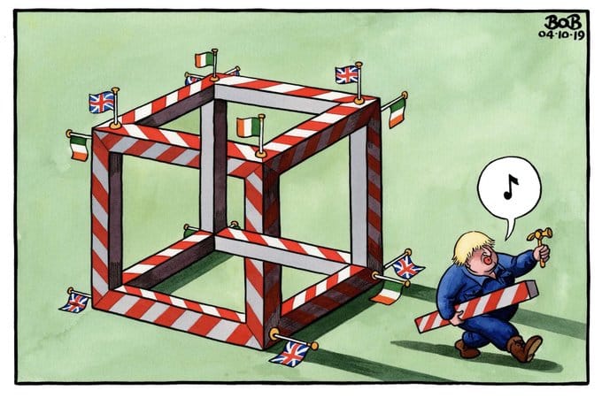 Bob Moran depicts Johnson walking away whistling a tune after creating an optical illusion, with reference to his new plan to keep Northern Ireland aligned with the EU common market even after Brexit.