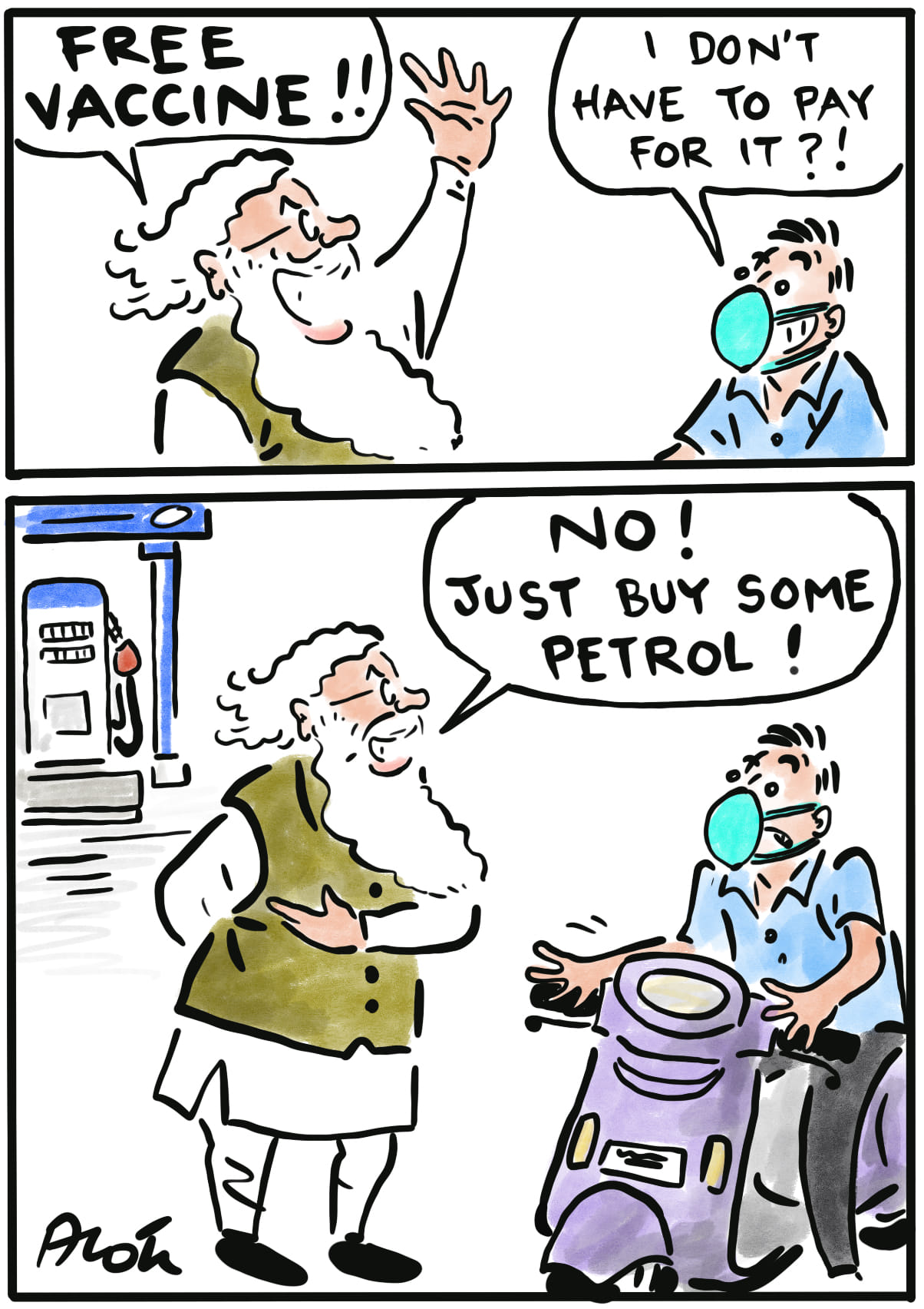 Alok Nirantar takes a jibe at the Modi government over rising fuel prices.