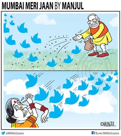In Mid-Day, cartoonist Manjul depicts the recent onslaught received by Sushma Swaraj at the hands of Twitter trolls, many of whom are avowed supporters of the BJP.