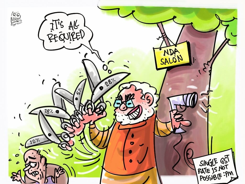Cartoonist Mika Aziz pokes fun at PM Narendra Modi’s comment that ‘milk and Mercedes’ couldn’t come under the same GST slab.