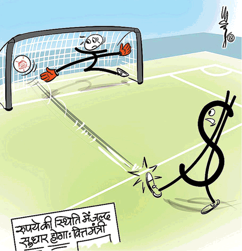Cartoonist Madhav Joshi in Dainik Jagran illustrates the fall of the rupee to an all-time low against the US dollar.