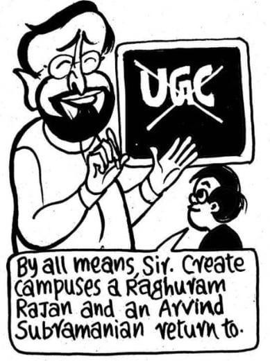 E.P. Unny takes a jab at the government’s decision to scrap the University Grants Commission for a single higher education body. Several Indian intellectuals employed by the government have chosen to return to a university career abroad instead of sticking around.
