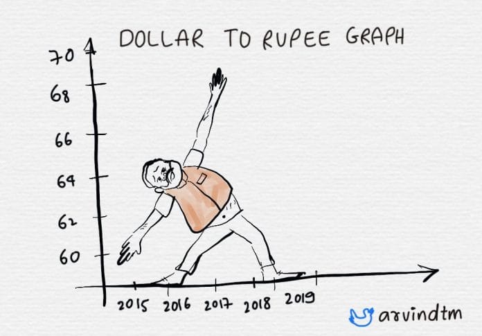 Cartoonist Arvind takes a dig at the falling value of the rupee.