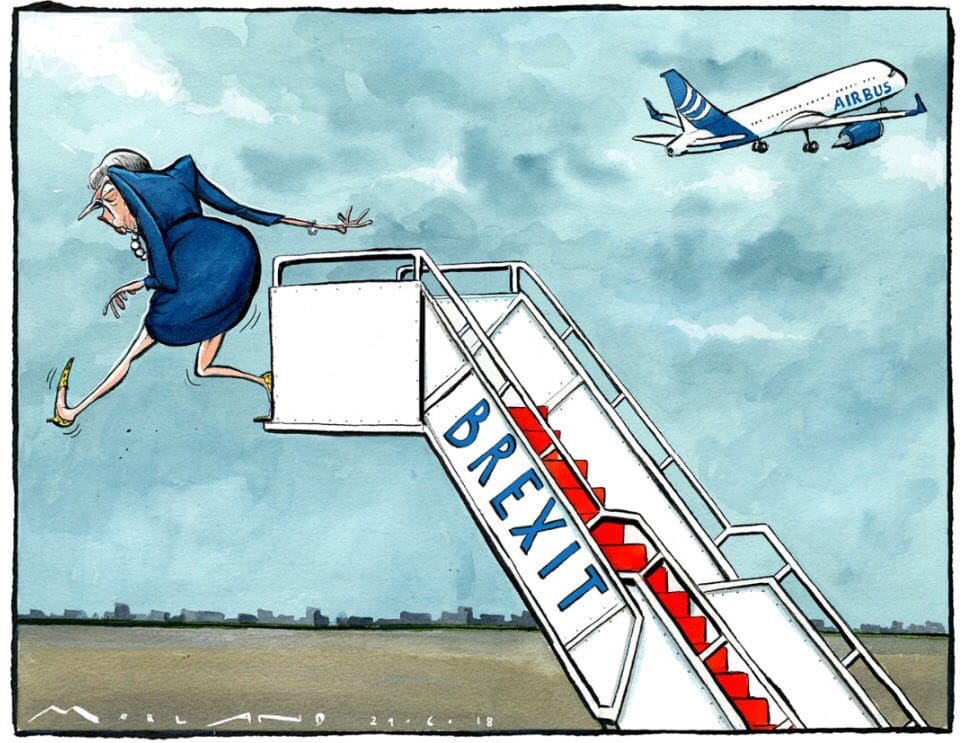 Morten Morland, for the Political Cartoon Gallery and Cafe in London, draws on Airbus’ threat to quit the UK after Brexit if PM Theresa May fails to agree to a trade deal with EU. The company, which employs about 14,000 people at 25 sites in the UK, said it will “reconsider its long-term footprint in the country” if there is no deal.