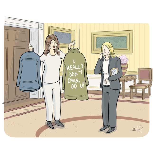 Obviously, this led to a furore in the international press that cartoonists all over the world have picked up on. In the first cartoon, Ellis Rosen, for The New York Times, comments on how the jacket was, in fact, a huge oversight and the defence – “It was just a jacket, no hidden message there” – incredibly weak, given the scrutiny the First Lady is put through before any appearances.