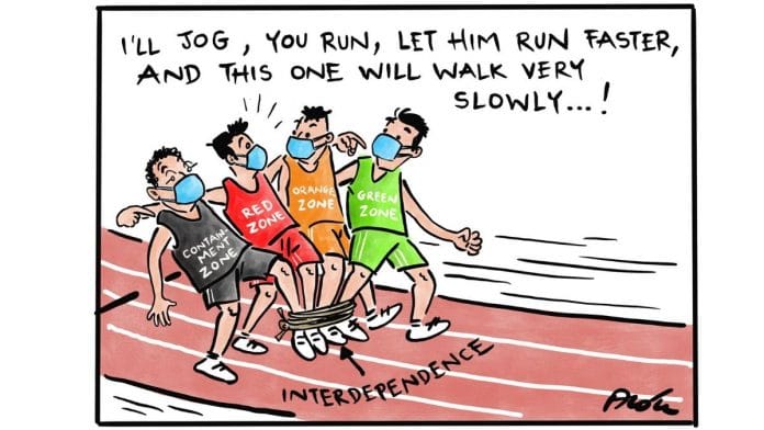 In today’s featured cartoon, Alok Nirantar illustrates the interdependence of the different zones to reach the Covid-19 finish line