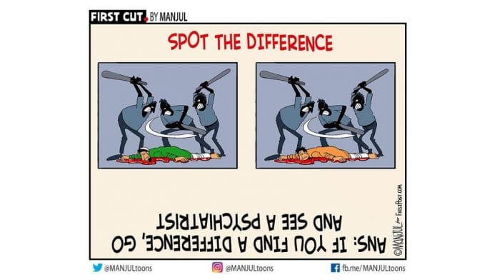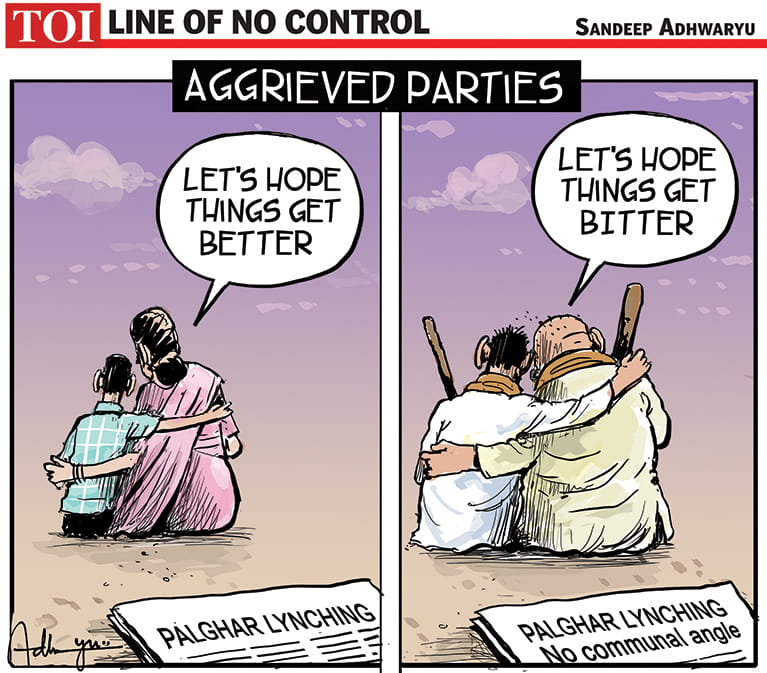 In today’s featured cartoon, Manjul invokes the recent case of mob lynching in Palghar where two sadhus and a man were beaten to death by a mob, and states that heinous crimes should not be communalised.