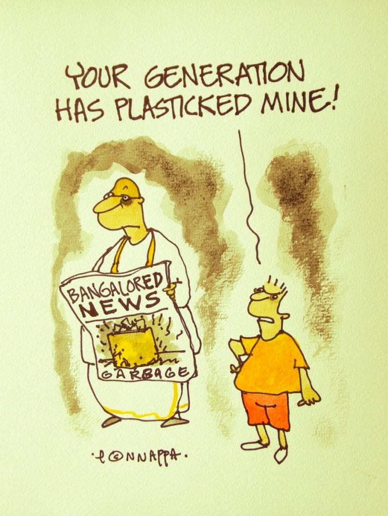As frothy over-polluted lakes overflow and garbage on the roads increases in Bengaluru, cartoonist Nala Ponnappa suggests that the second generation has been ‘plasticked’ by the current one. For context, people sacked at IT firms abroad for jobs outsourced to India in the early days of BPOs were described as having been ‘Bangalored’.