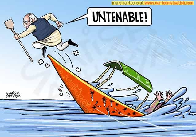 On Sify.com, Satish Acharya shows Narendra Modi jumping out of the Kashmir boat as it’s being sunk by a spurt in extremist activity. Announcing the split, BJP national secretary Ram Madhav had called the alliance “untenable”.