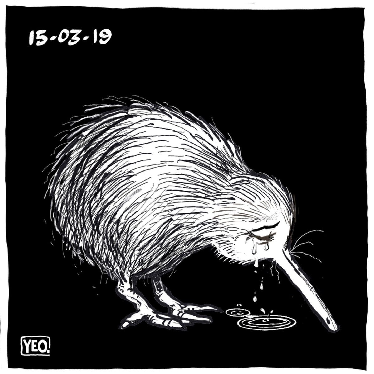 Shaun Yeo depicts a Kiwi, regarded as New Zealand’s national symbol, shedding tears for the victims of Friday’s attack on two mosques. Kiwis, as residents of New Zealand are known, who prized their nation’s image as a peaceful haven have been struggling to come to terms with the attack.