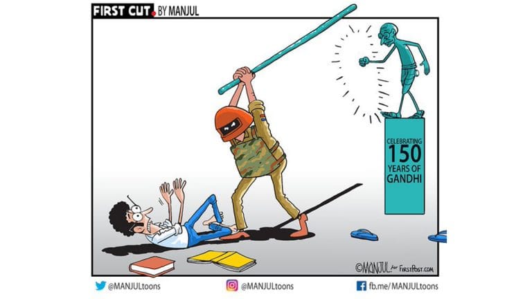 Manjul illustrates how the lathi, which was once used by Mahatma Gandhi in his non-violent protests, is now being used to suppress dissent in Modi’s India.