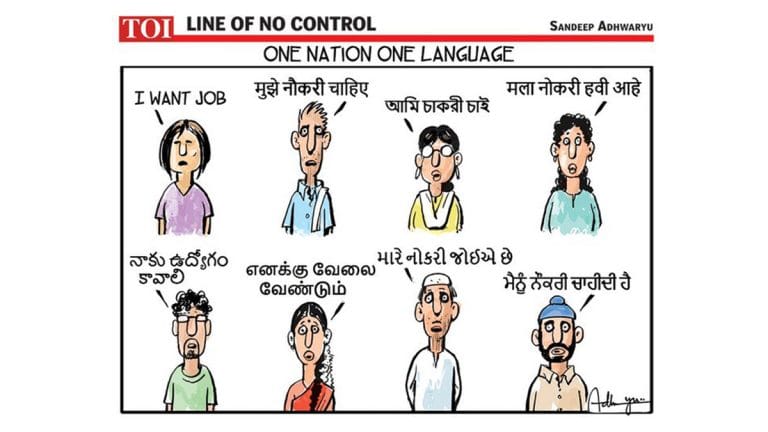 Sandeep Adhwaryu illustrates India’s ethnic and linguistic diversity, and the economic slowdown in a sharp jibe at the Modi government.