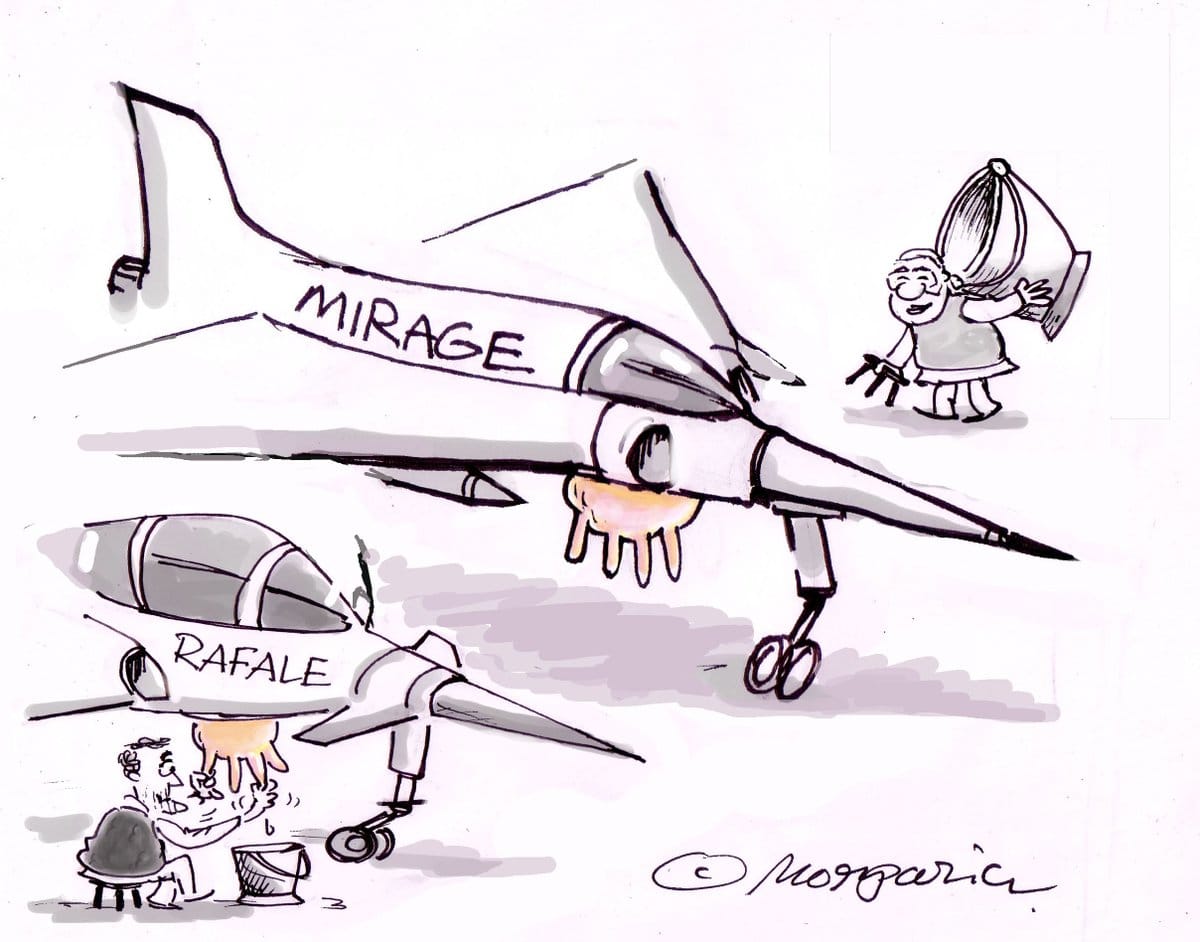Hemant Morparia shows Rahul Gandhi milking the Rafale jet ahead of the Lok Sabha elections, and Prime Minister Narendra Modi rushing to catch up by milking the Mirage-2000, the aircraft that carried out the Indian Air Force air strikes on Balakot, Pakistan.