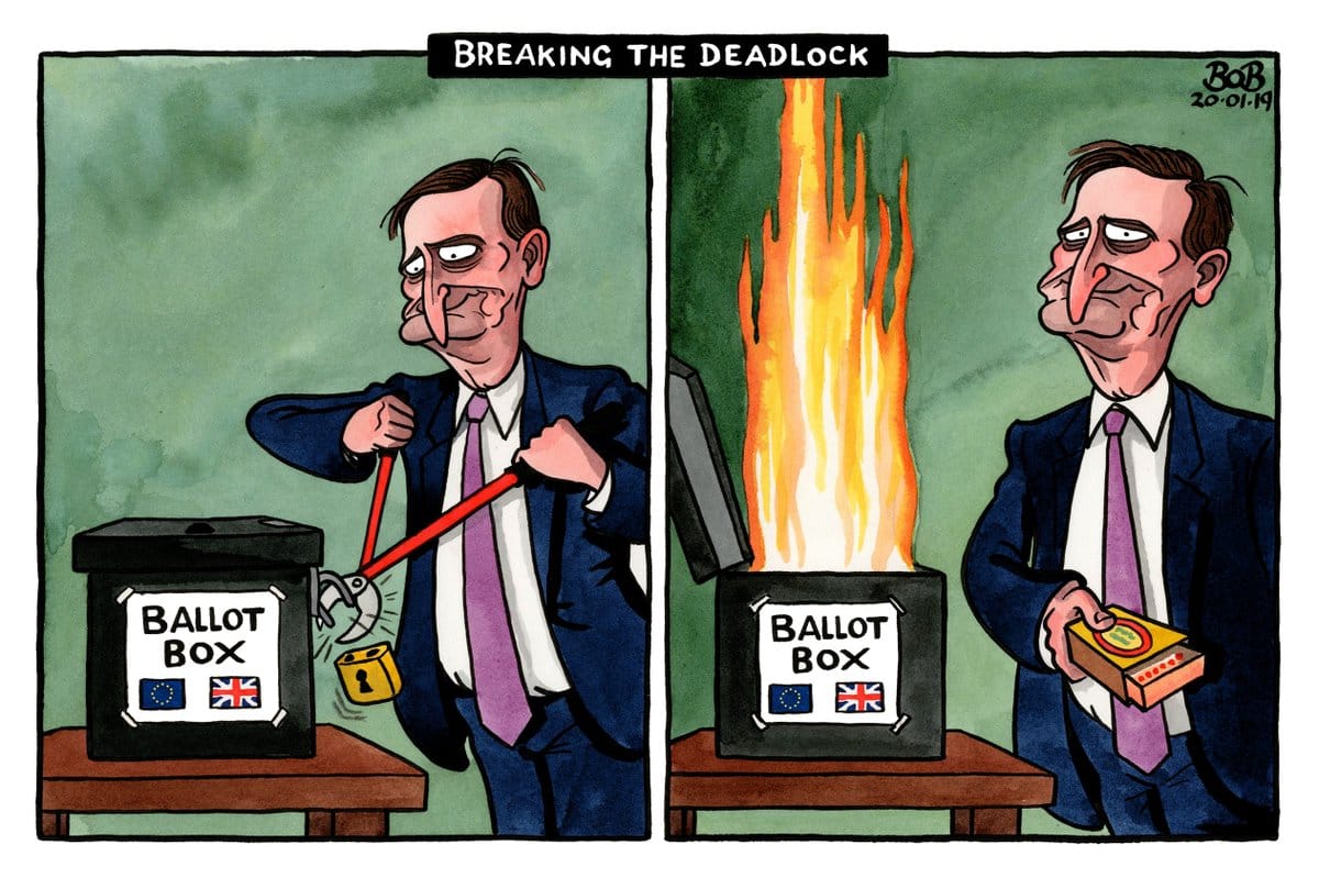 Bob Moran for The Telegraph mocks UK Conservative MP Dominic Grieve. He is said to be leading a group of rebel MPs who were opposed to Brexit before the 2016 referendum, and now want to stop a ‘no-deal’ Brexit.