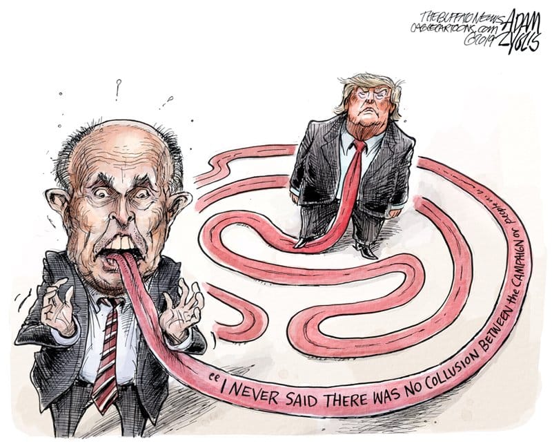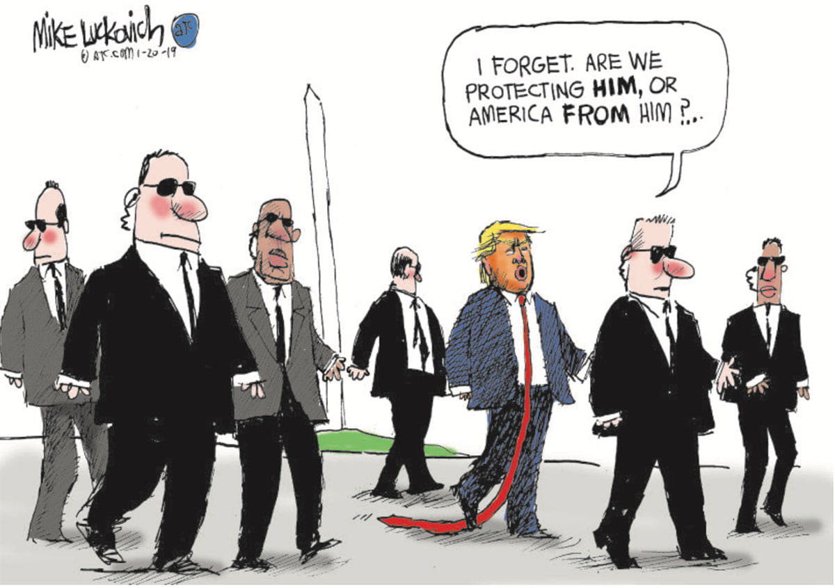 Mike Lukovich’s cartoon features the US president again. This time he is surrounded by his bodyguards who are confused about their task, especially after the backlash Trump has received on his immigration policy.