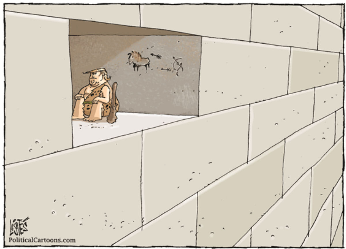 Croatian political cartoonist Nikola Listes shows Trump dressed like a Neanderthal and holed in a wall that he himself has proposed to build on the US-Mexico border. Trump has proposed limited legal protection for undocumented immigrants in exchange for money to build his proposed border wall, a plan that has come under attack from Democrats in the US Congress.