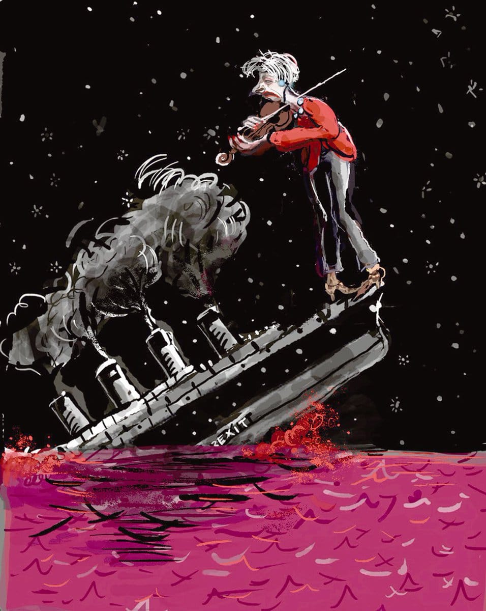 Clifford Cocker recreates the iconic ‘violins’ scene from James Cameron’s Titanic. In his take, the sinking ship is Brexit, and the violinist is UK Prime Minister Theresa May.