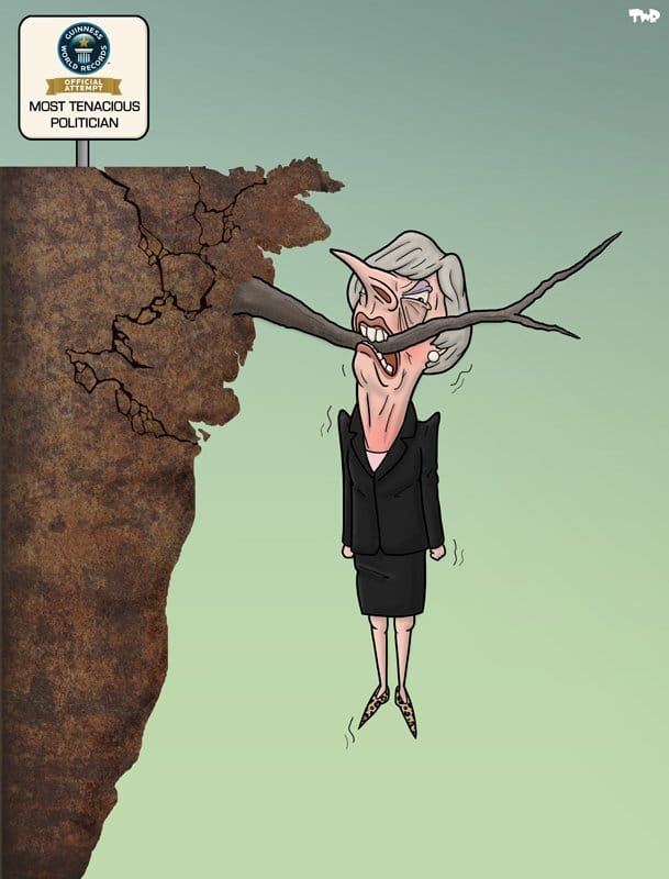 Dutch cartoonist Tjeerd Royaards suggests that May is attempting a Guinness record for being the most tenacious politician, hanging on with her teeth despite all the ignominy Brexit has brought upon her.