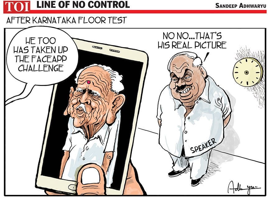 Sandeep Adhwaryu refers to the recent FaceApp challenge that has taken social media by storm, while alluding to the unending political drama in Karnataka.