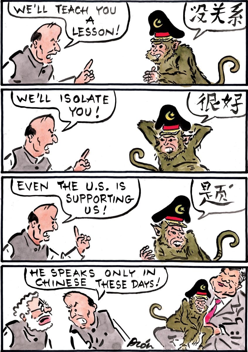In the aftermath of the Pulwama massacre, Alok Nirantar shows Union Home Minister Rajnath Singh threatening a monkey in a Pakistan Army general’s uniform. The monkey only speaks Chinese and is sitting on a Chinese man’s lap, with the allusion being to the strengthening ties between Pakistan and China.