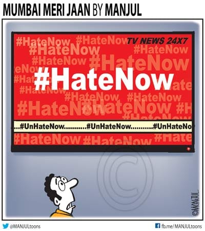 Manjul takes a thinly-veiled dig at India’s ‘commando comic’ TV channels, which have been baying for blood and mongering hate after the Pulwama attack, but simultaneously run anti-hate hashtags.