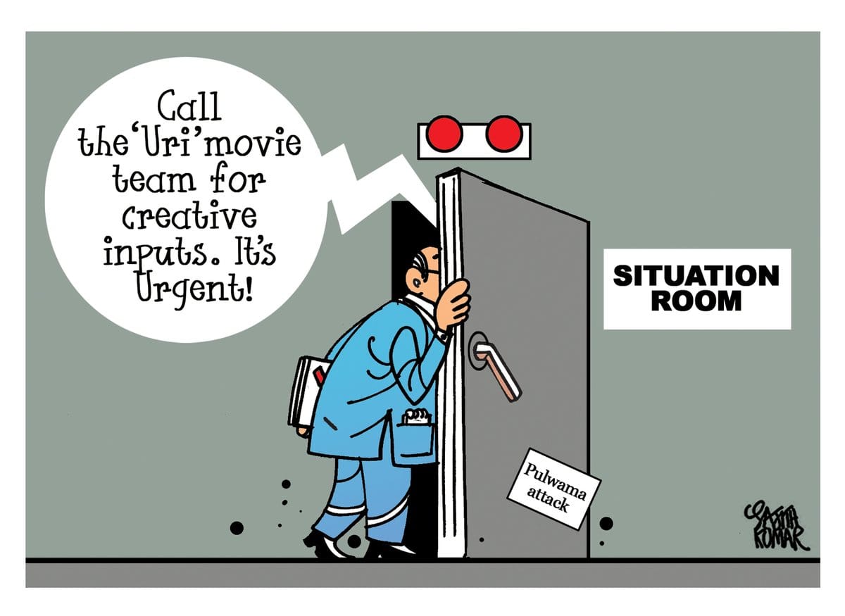 From within the ‘Situation Room’ where a response to the Pulwama attack is probably being discussed, Sajith Kumar depicts a voice summoning the team of the film Uri (based on the surgical strikes of 2016) for ‘creative inputs’ about how India should respond.