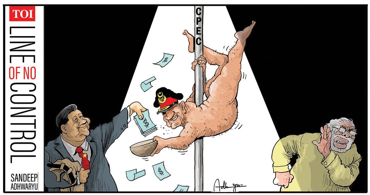 Sandeep Adhwaryu depicts a Pakistan Army general pole-dancing to get money from China, while Indian PM Narendra Modi gets an eyeful.