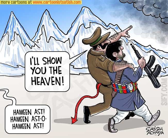 Satish Acharya depicts the devil in Pakistani army luring Kashmiri youth to attain heaven via the path of terror. The irony is that Amir Khusro had written of Kashmir