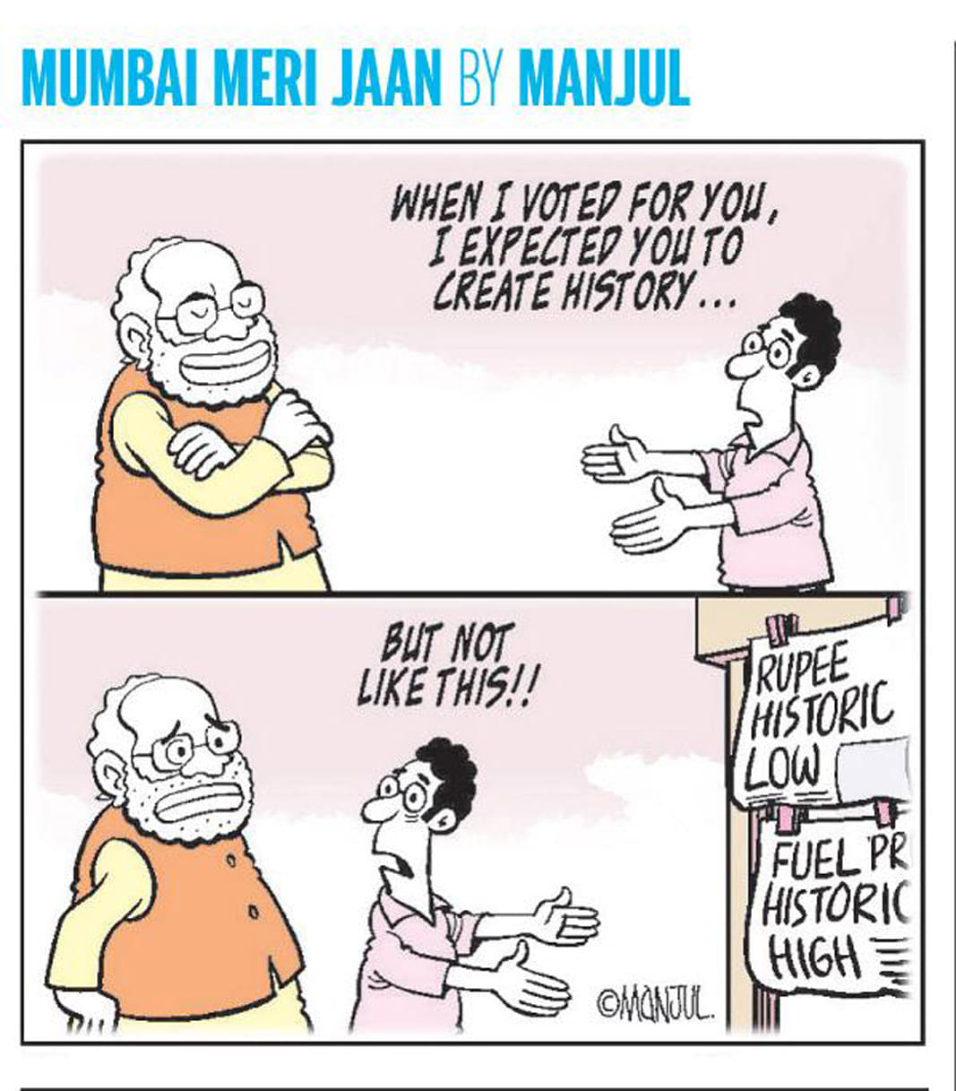 Manjul in Midday takes a dig at the falling rupee and rising fuel prices.