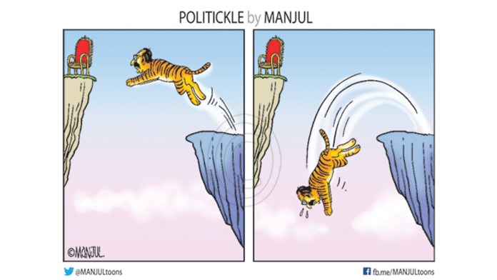 In today’s featured cartoon, Manjul depicts Shiv Sena chief Uddhav Thackeray literally falling through the cracks while making a leap for the Maharashtra chief minister’s seat.